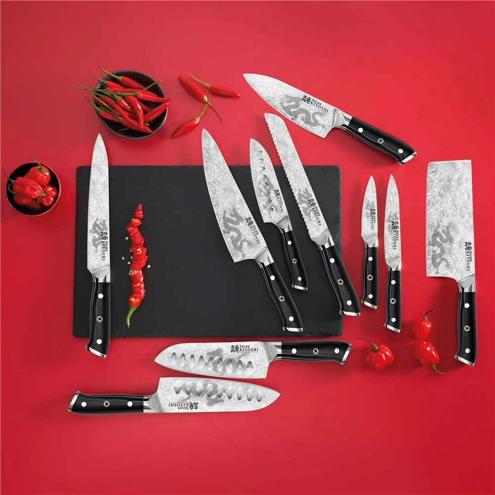 Baccarat® KIYOSHI™ range features distinctive Damascus inspired blades inspired by traditional Japanese craftsman and Samurai sword makers, being characteristic of banding and mottling reminiscent of flowing water. Each blade also has a distinctive trademark Dragon insignia.