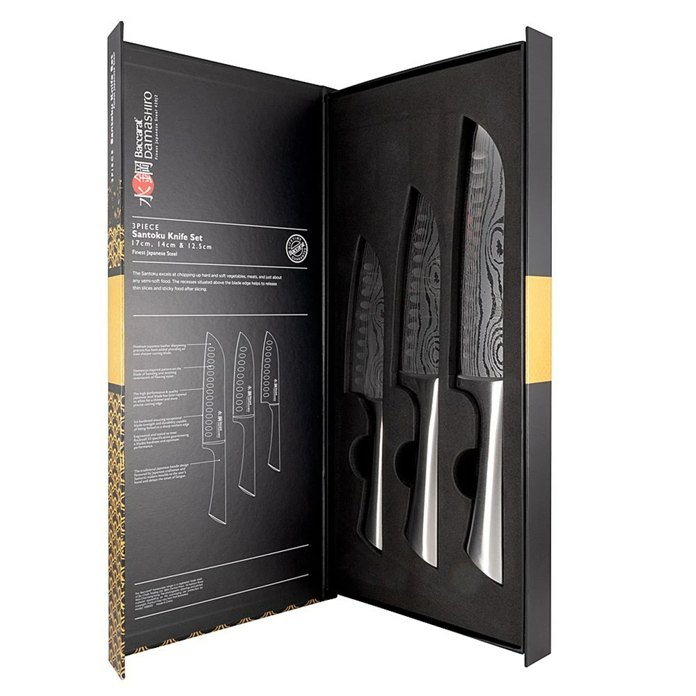- The Baccarat® Damashiro® Santoku Knife Set contains: 1x 17cm santoku knife, 1x 14cm santoku knife and 1x 12.5cm santoku knife
