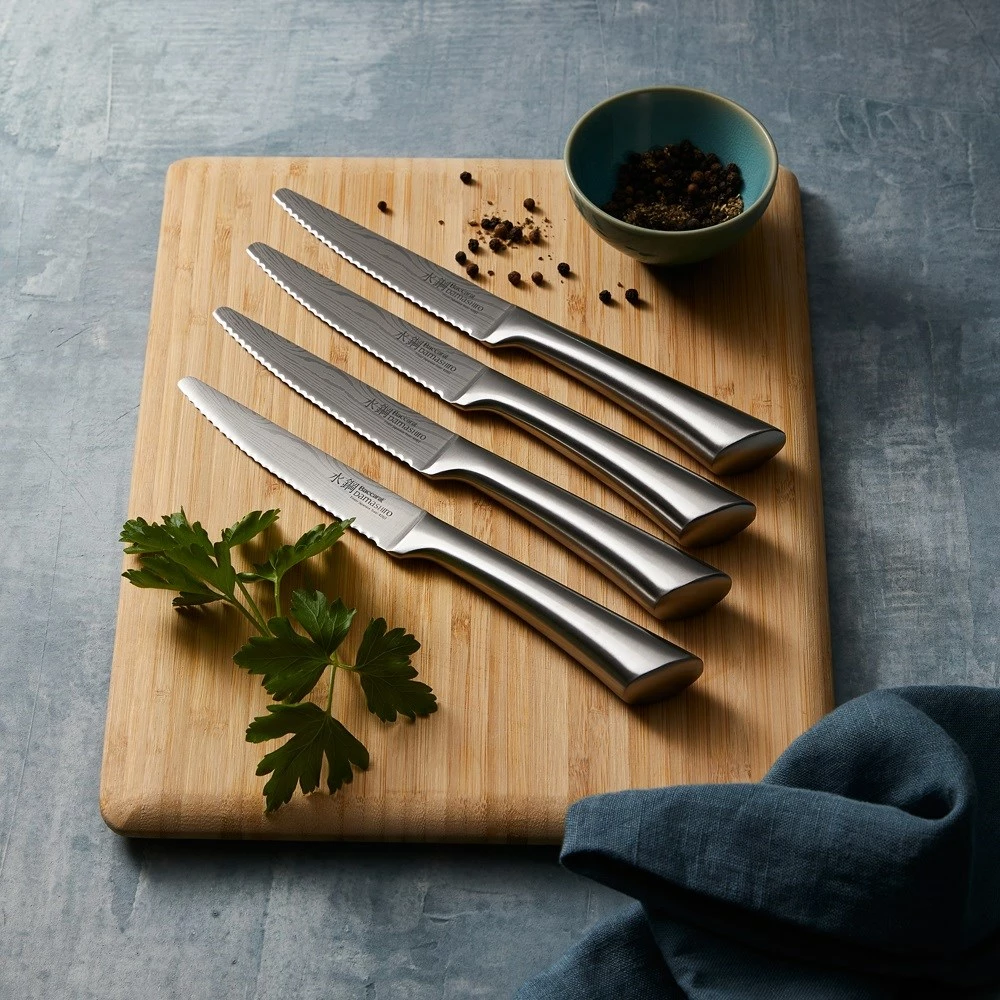 The performance of the Baccarat® Damashiro® 4 Piece Steak Knife Set makes it a #1 essential. The best meals deserve the Best equipment. These knives feature razor sharp serrated edges for cutting through meat without crushing or tearing. Enjoy delicious roast dinners, steak nights and other meat dishes with this 4 Piece Set.