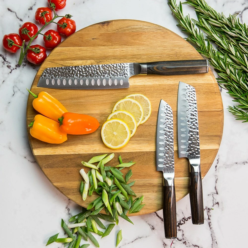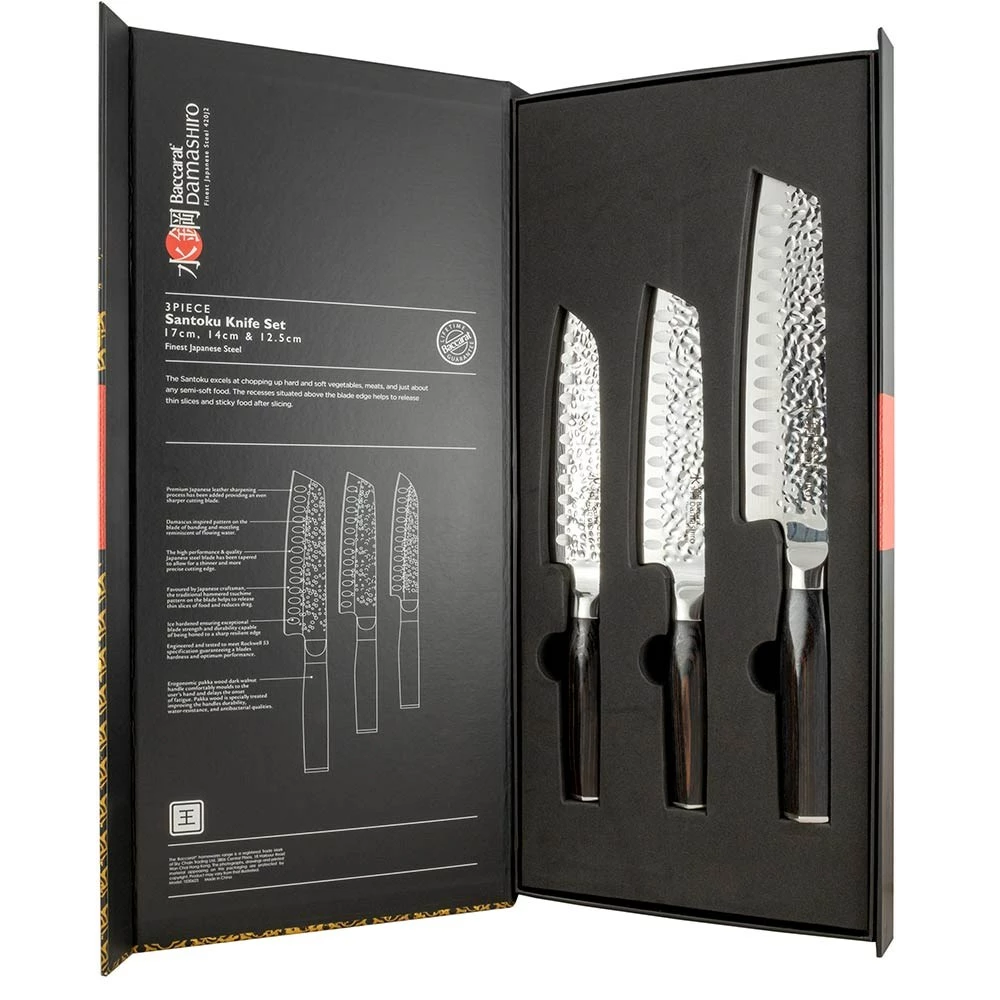 - The Baccarat® Damashiro® EMPEROR Santoku Set contains: 1 x 17cm Santoku, 1 x 14cm Santoku, 1 x 12.5cm Santoku. The Damashiro® EMPEROR Santoku is #1 in the kitchen for Cutting, Slicing, Chopping, Dicing, Mincing and so much more. It is the Perfect knife when cutting meats, slicing cheeses, and chopping or dicing vegetables and nuts. The recessed scallops situated above the blade’s edge assists to release thin slices and sticky food after slicing.