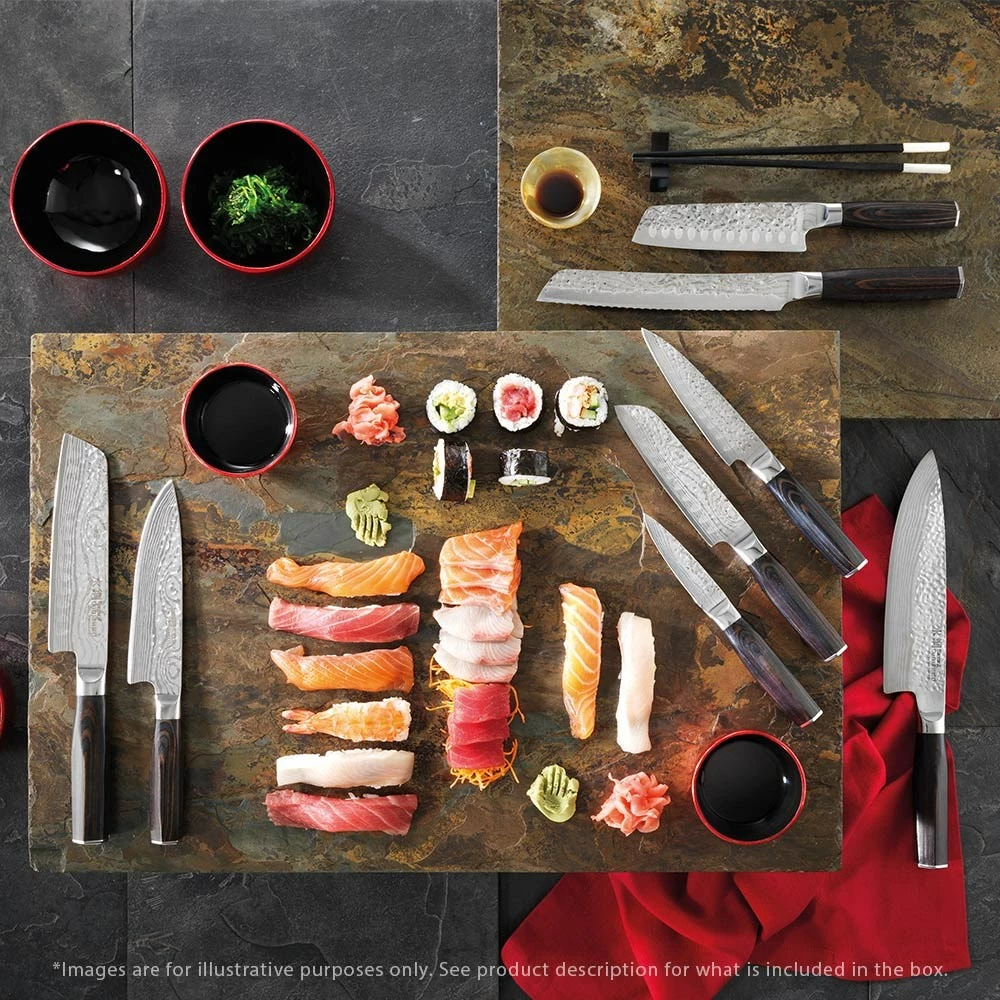 The Baccarat® Damashiro® EMPEROR Santoku Set is guaranteed to deliver you the best agile chopping experience. The knife’s low tip and broad blade makes it a cook’s best friend for slicing, dicing and mincing.