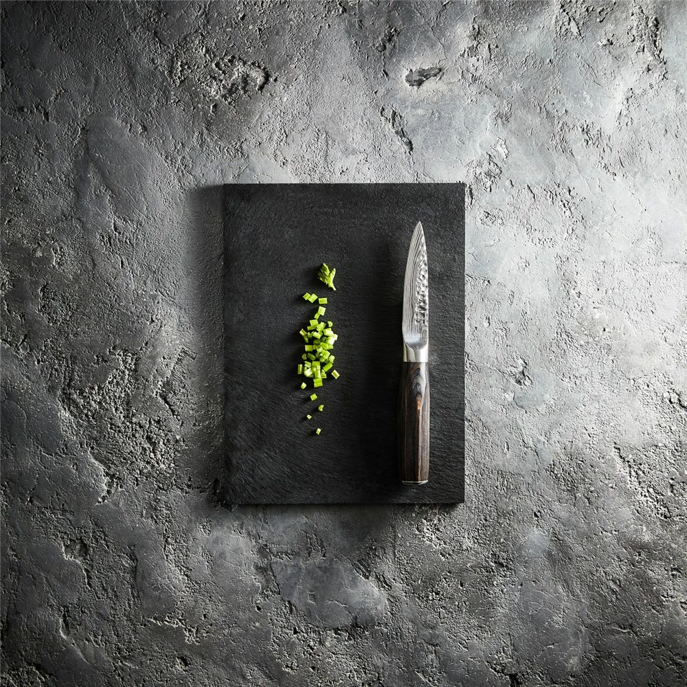 The Baccarat® Damashiro® EMPEROR Paring Knife (9cm) is a ‘must have’ kitchen knife. Perfect for the intricate and everyday culinary tasks of peeling and slicing fresh produce. Its razor sharp blade edge makes for incredible precision and control.