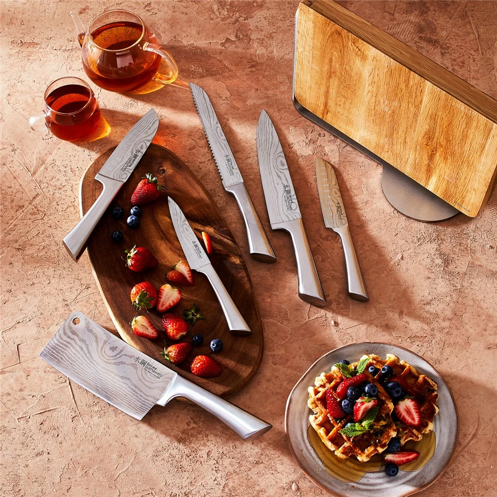 - A comprehensive set that is equipped with 1 x 20cm Chef?s Knife, 1 x 17cm Cleaver Knife, 1 x 20cm Carving Knife, 1 x 14cm Santoku Knife, 1 x 12.5cm Santoku Knife, and 1 x 12cm Utility Knife housed on a premium Acacia wood magnetic knife block