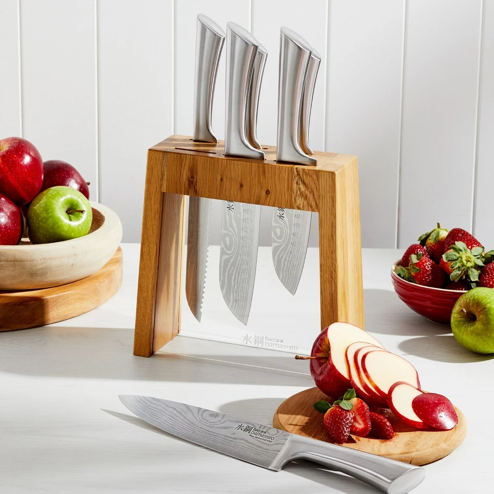 - The Baccarat® Damashiro® 7 Piece Mizu Knife Block Oak set contains: 1 x 20cm/8″ Chefs knife, 1 x 20cm/8″ Bread knife, 1 x 17cm/6.5″ Santoku knife, 1 x 14cm/5.5″ Santoku knife, 1 x 12cm/4.5″ Utility knife, 1 x 9cm/3.5″ Paring knife