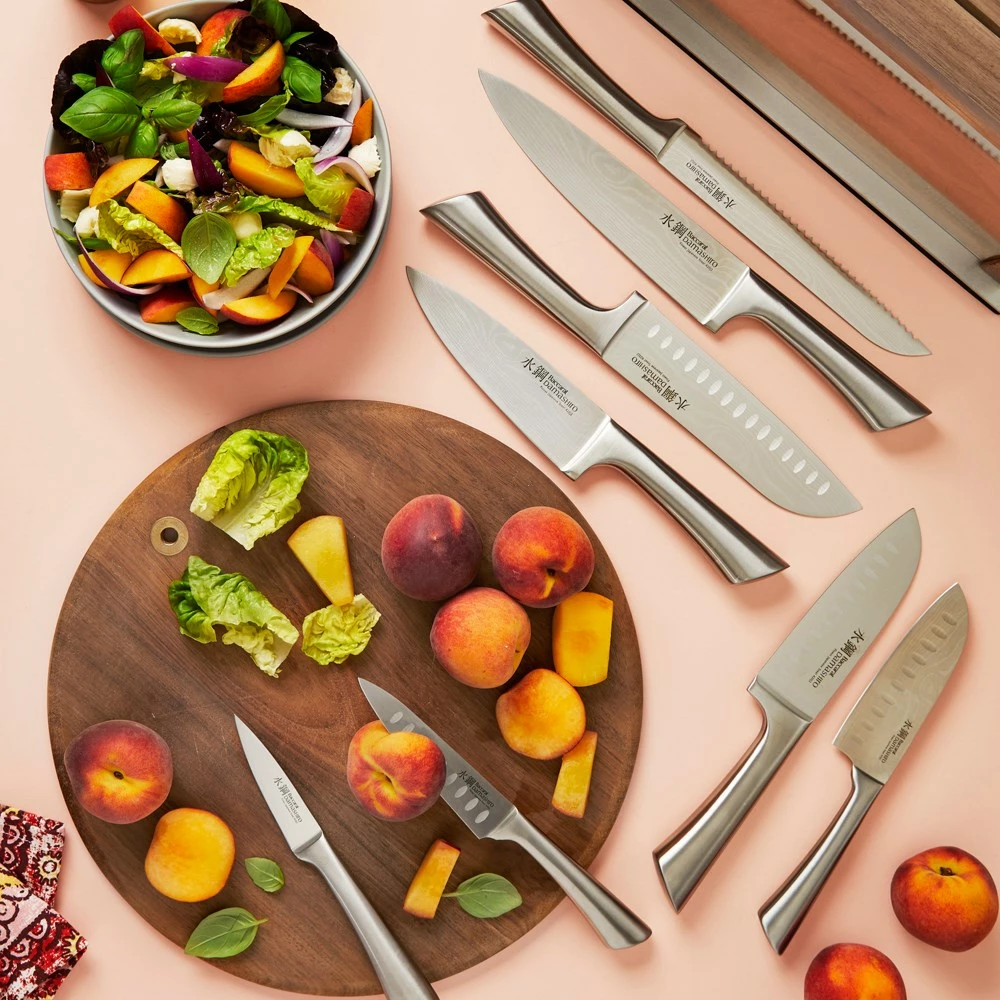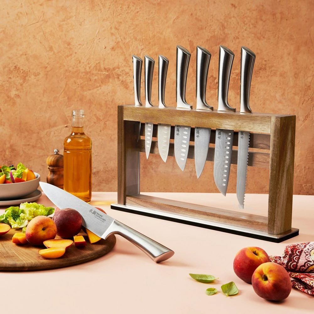 - Comprehensive knife set features a 20cm chefs knife, 20cm bread knife, 17cm santoku knife, 14cm santoku knife, 15cm mini chefs knife, 12.5cm santoku knife, 12cm utility knife and 9cm paring knife housed in a stylish knife block