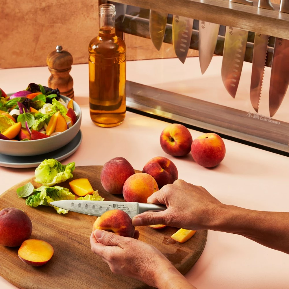 Update your culinary collection and prepare meals like a professional chef with the Baccarat Damashiro Okada 9 Piece Knife Block! Fantastic for slicing and dicing all kinds of fresh ingredients, this set is an essential for every avid home cook. The Damashiro knives are crafted from the finest quality Japanese steel which offers lasting durability and optimum performance. The design is inspired by traditional Japanese craftsmanship and Samurai sword makers and are characterised by a distinctive traditional inspired Damascus on the blade of banding and mottling, reminiscent of flowing water. Comprising of 20cm chefs knife, 20cm bread knife, 17cm santoku knife, 14cm santoku knife, 15cm mini chefs knife, 12.5cm santoku knife, 12cm utility knife and 9cm paring knife housed in a stylish knife block, this set offers everything you need for exceptional food preparation experiences. Made from acacia wood, each knife block is guaranteed to offer a truly unique colour that sets it above the rest. Each blade in engineered and tested to meet Rockwell 53 specification ensuring long-lasting optimum performance. Explore your passion for cooking and prepare all kinds of delicious meals with the Baccarat Damashiro Okada 9 Piece Knife Block!