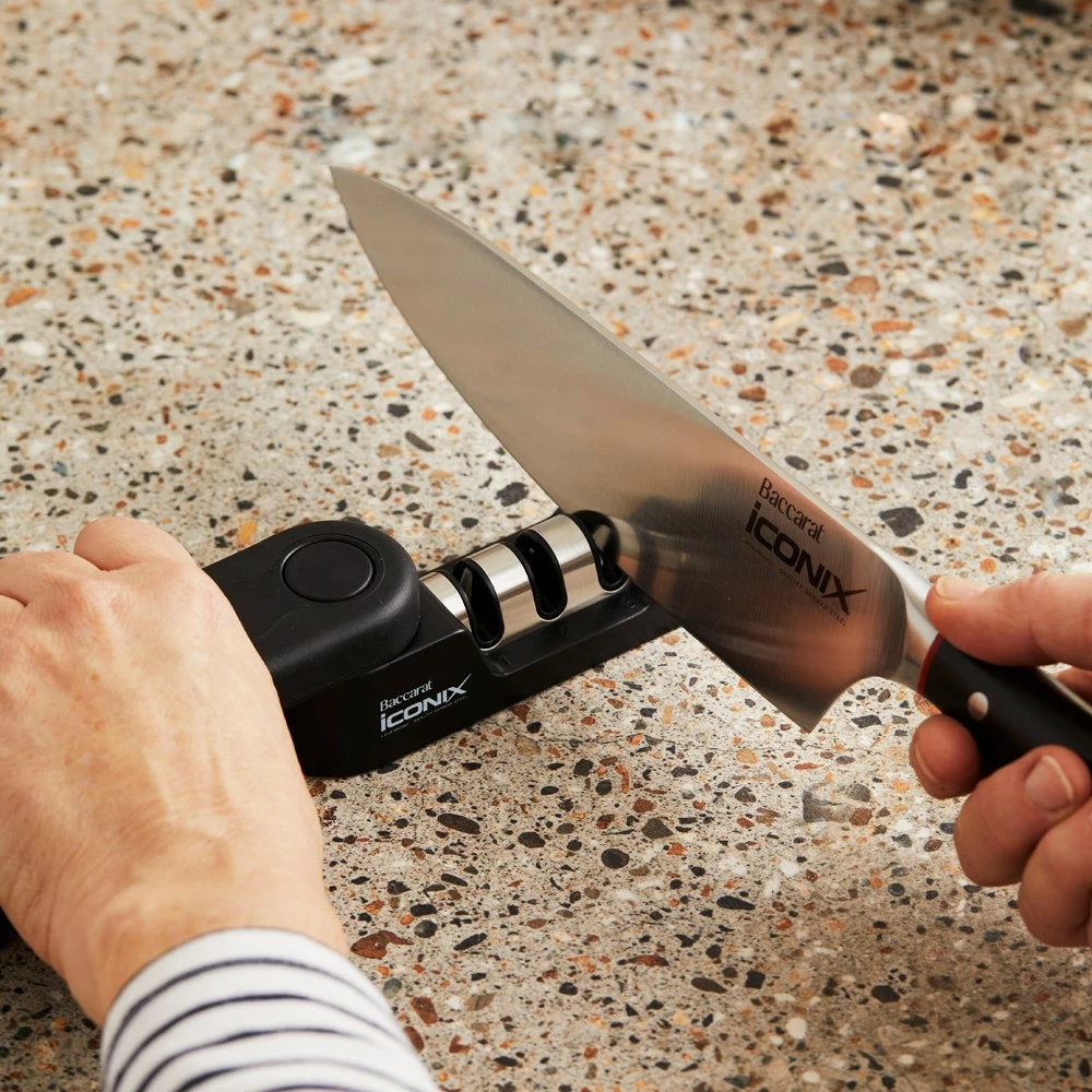 - This intelligent Baccarat® iconiX® knife sharpener allows for coarse sharpening to repair and sharpen dull blade edges, transforming your knives back to their former glory. It features a honing ability adding a refined edge to a freshly sharpened blade.