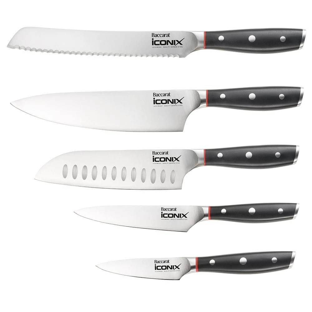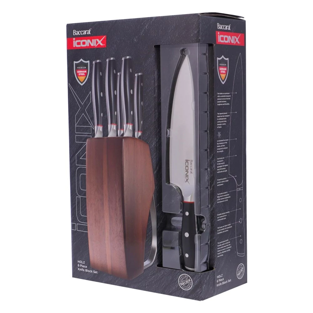 - The Baccarat® iconiX® Holz 6 Piece Knife Block contains: 1x 9cm Paring Knife, 1x 12cm Utility Knife, 1x 18cm Santoku Knife, 1x 20cm Bread Knife and 1x 20cm Chefs Knife. Housed in a stylish acacia wood knife block to showcase your blades.