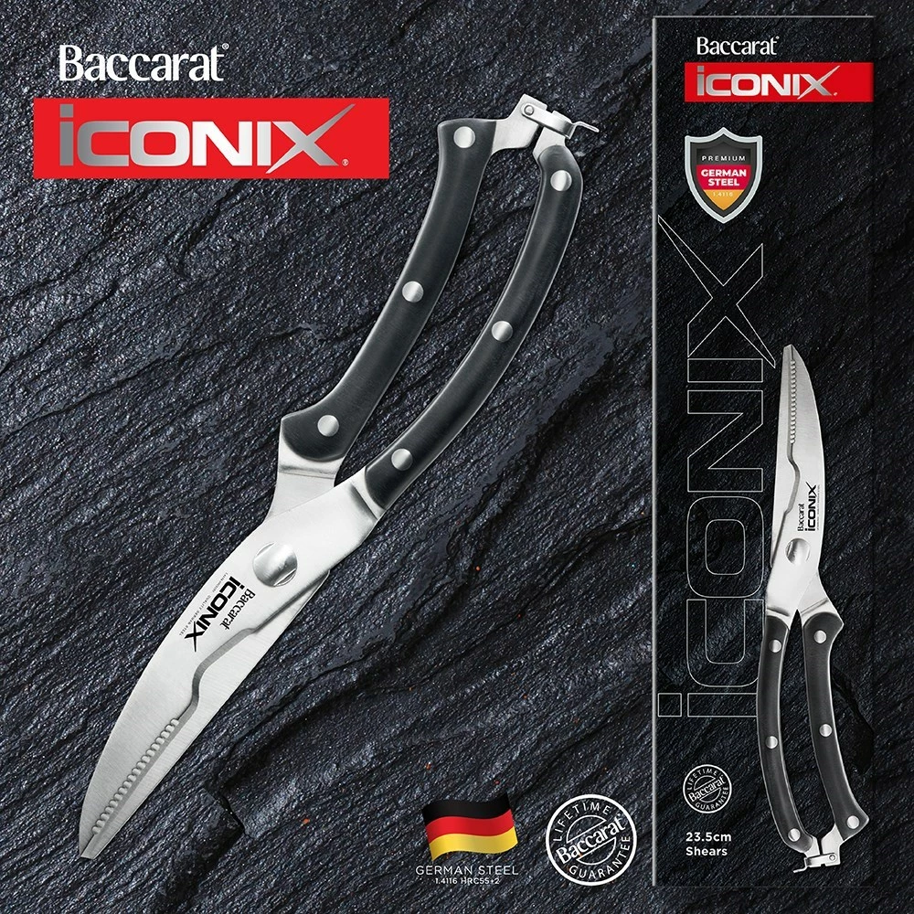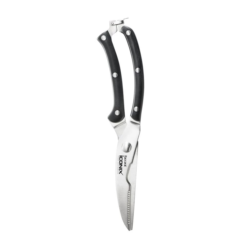- The Baccarat® iconiX® Kitchen shears are a perfect addition to any Cook’s kitchen. It has an easy motion spring-loaded action and safety lock. The blade angle is perfect for trimming and snipping, whilst being able to power through meat and gristle. The curved blades allow for easier cutting around bones and tricky hard-to-reach places.