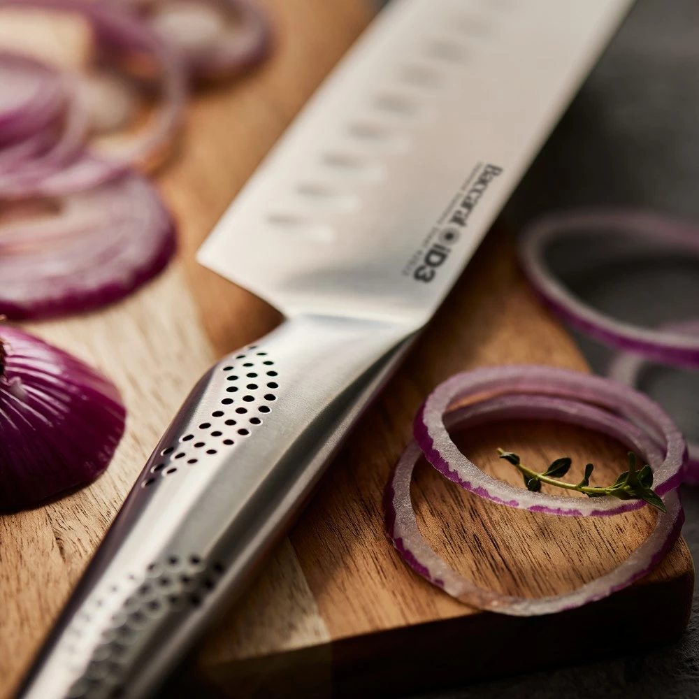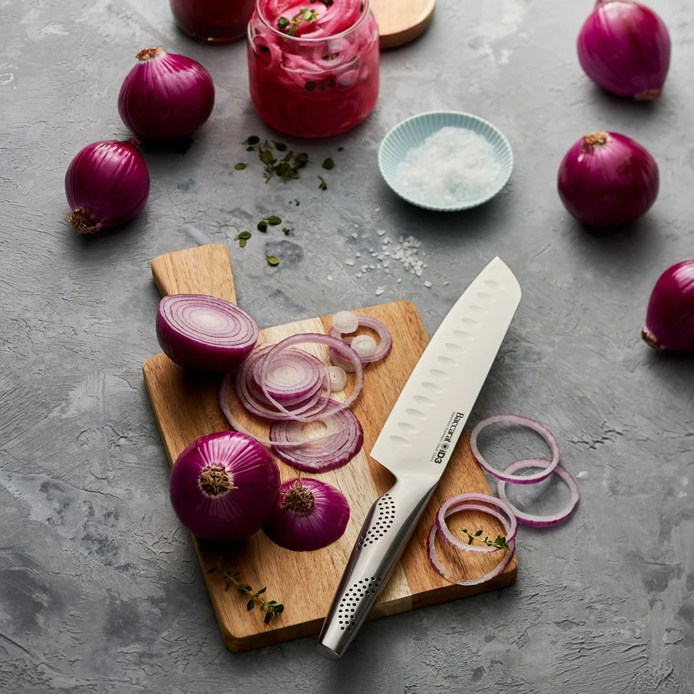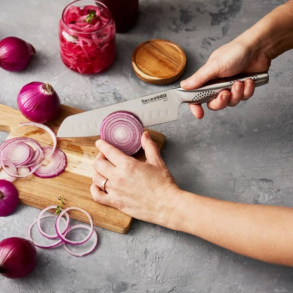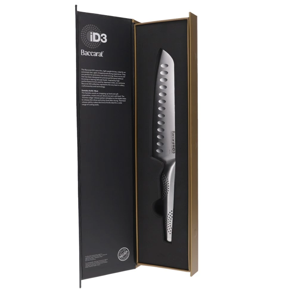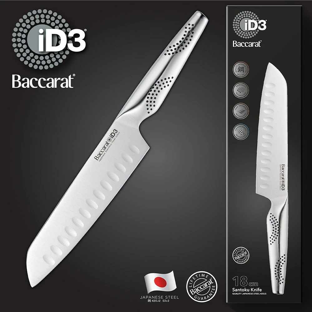 - The Baccarat® iD3® Santoku is #1 in the kitchen for Cutting, Slicing, Chopping, Dicing, Mincing and so much more. It is the perfect knife when cutting meats, slicing cheeses, and chopping or dicing vegetables and nuts. The recessed scallops situated above the blade’s edge assists to release thin slices and sticky food after slicing.