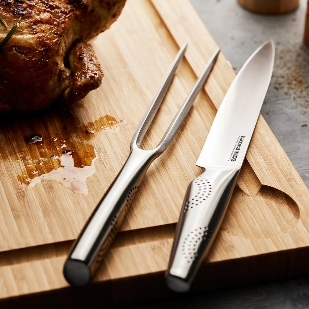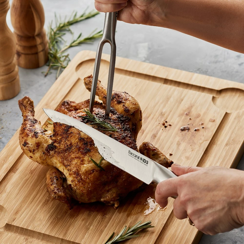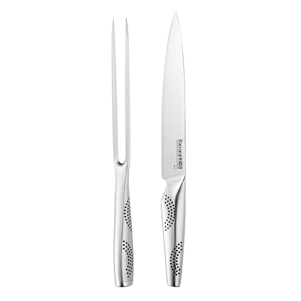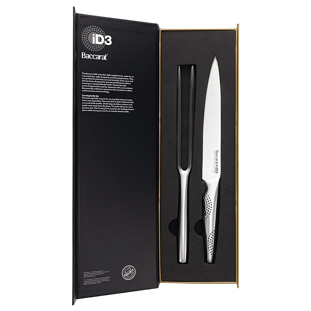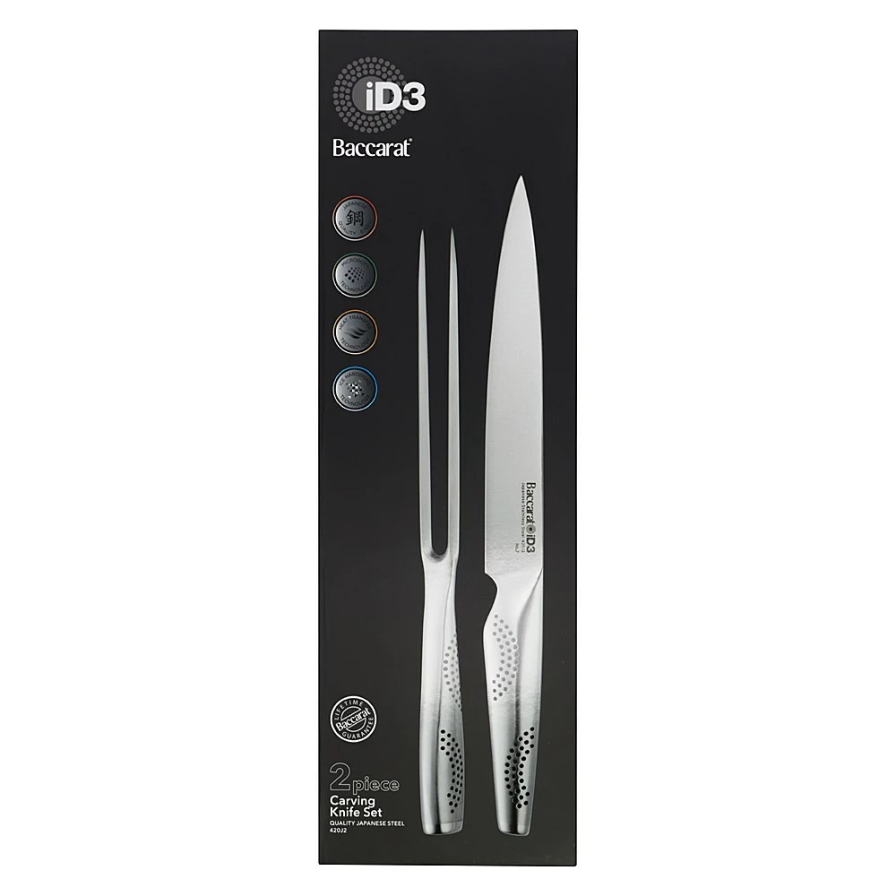 - The Baccarat® iD3® Carving set is perfect for carving and serving meats with ease. The knife’s curved blade profile help to follow contours and guide meat away from the bone. The carving fork is perfect for holding meat in place while slicing and helps to transfer food to plate. The Baccarat® iD3® Carving Knife Set contains: 1 x 20cm carving knife and 1 x 17cm carving fork.