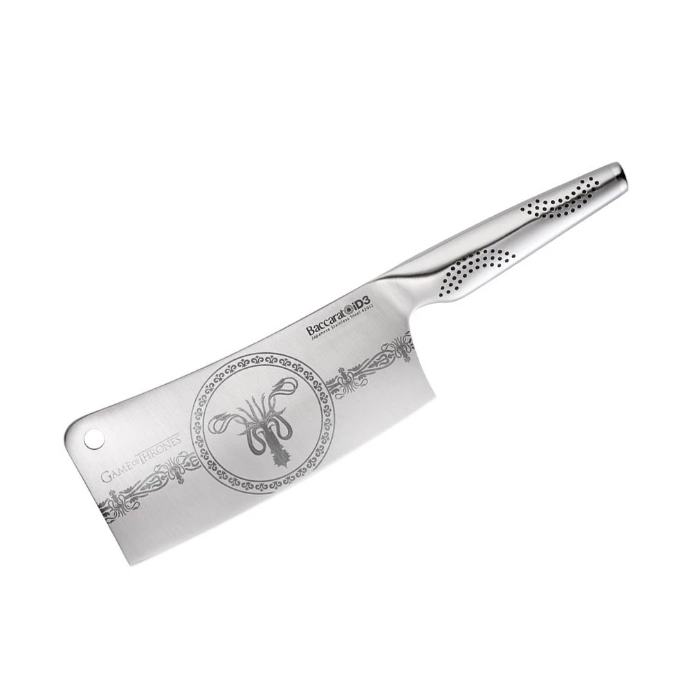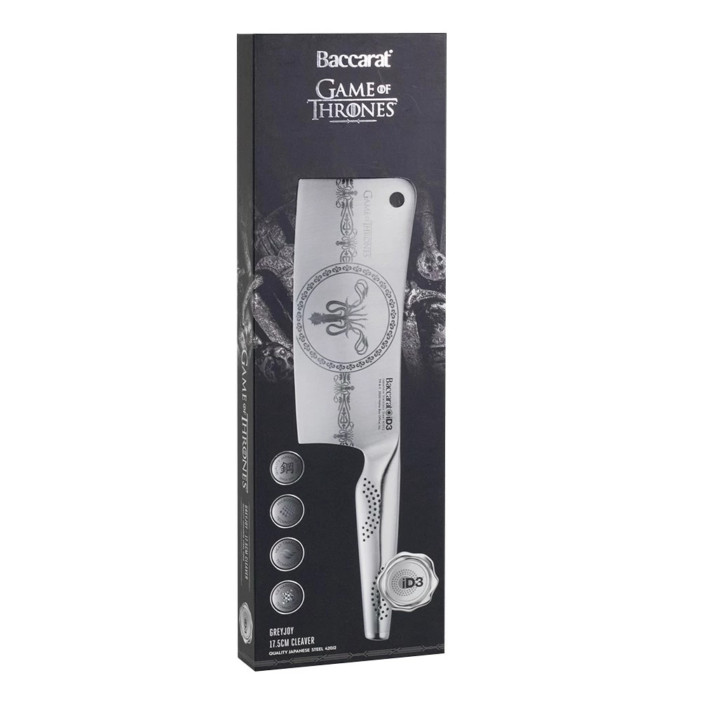 When summers spanned decades and the winters seemed endless, nine honourable families battled for the Iron Throne. Vow your loyalty to your favourite house of Westeros with The Baccarat iD3 Cleaver Knife 17.5cm. The Baccarat iD3 Cleaver Knife 17.5cm is an essential blade for kitchen tasks that features the House Greyjoy sigil, the Golden Kraken. The Baccarat iD3 Cleaver Knife 17.5cm is heavily weighted and fortified to slice through joint and bone. Engineered for power and force, this allows the cook to portion poultry and cut meat of any size with precision and control. The ergonomically designed handle, fully integrated into the blade, ensures a secure grip for safe and precise cutting, while the patented iD3 Microdots positioned along the handle actively relieve pressure in the hand to reduce cutting fatigue. Hand washing is recommended to maintain blade quality, however the Baccarat iD3 Cleaver is dishwasher friendly.