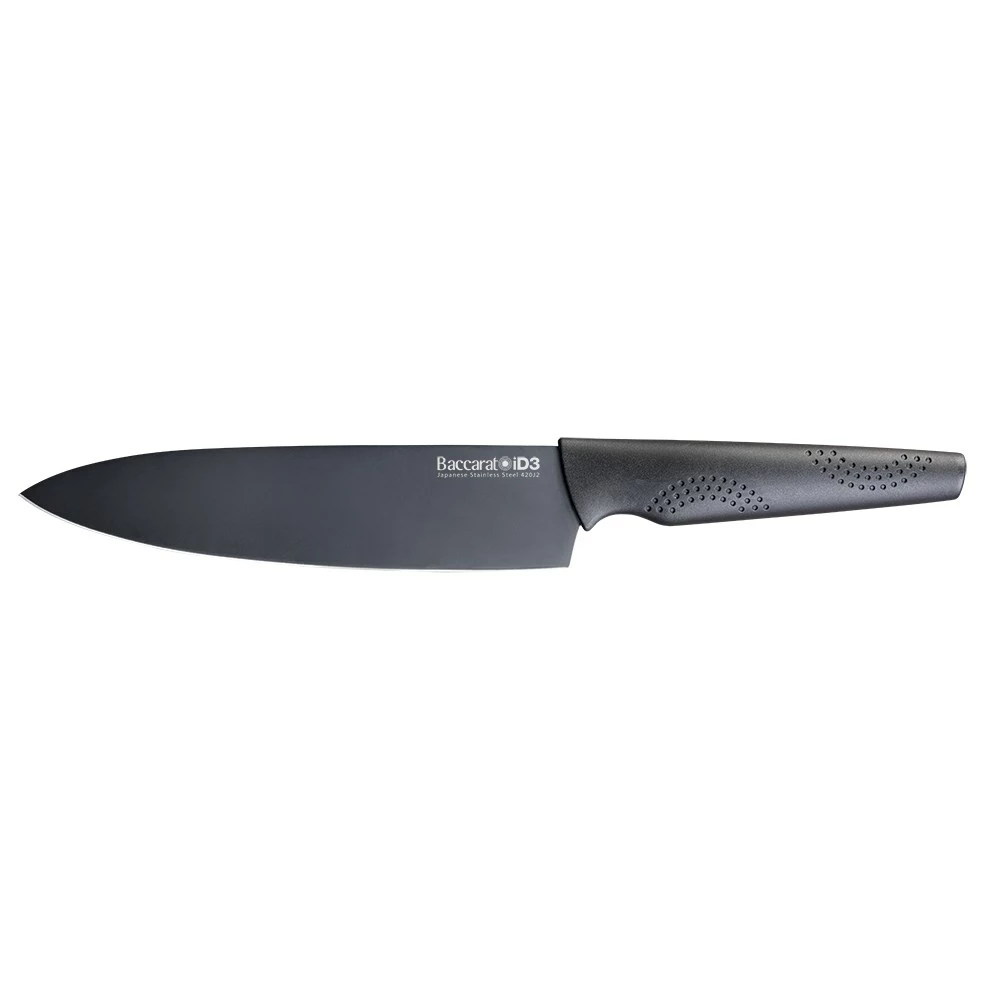 The Baccarat iD3 CS Chefs Knife 15cm is a small all-purpose knife ideal for general tasks in the kitchen. This quintessential knife is useful for making classic cuts such as julienne, fine chopping and dicing and can be used for fruits, vegetables, meats and fish. Constructed from premium quality Japanese steel, the Baccarat iD3 CS Chefs Knife 15cm features a razor-sharp cutting edge that has exceptional edge retention. Featuring stylish matte black coating and Microdots on the resilient stainless-steel handle, this knife ensures style, comfort, control and precision when doing the chopping work. Rockwell Hardness tested and ice hardened, the Baccarat iD3 CS Chefs Knife 15cm promises the highest level of hardness and tensile strength for superior quality and long-lasting use.