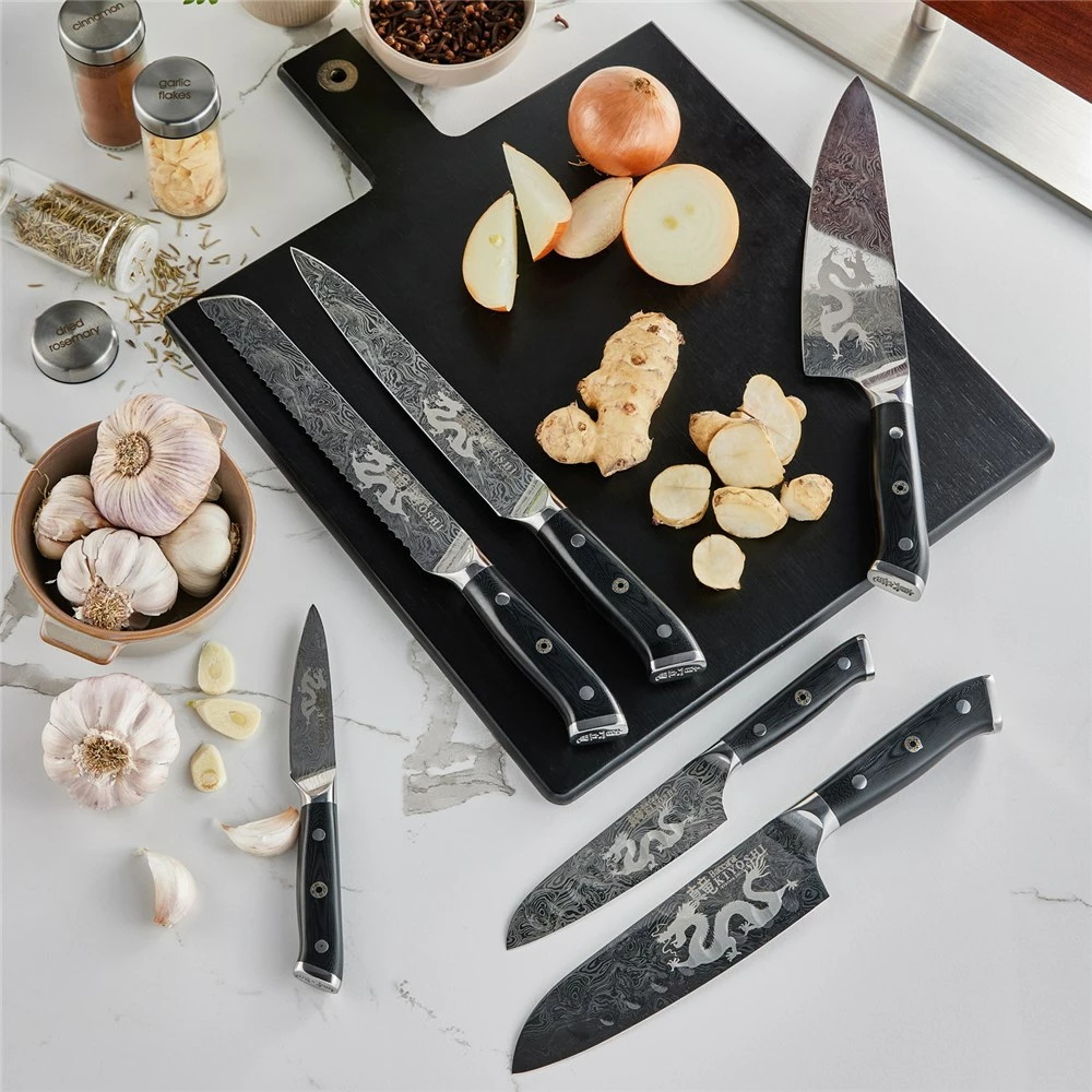 - Traditional Damascus inspired blades featuring a distinctive trademark Dragon