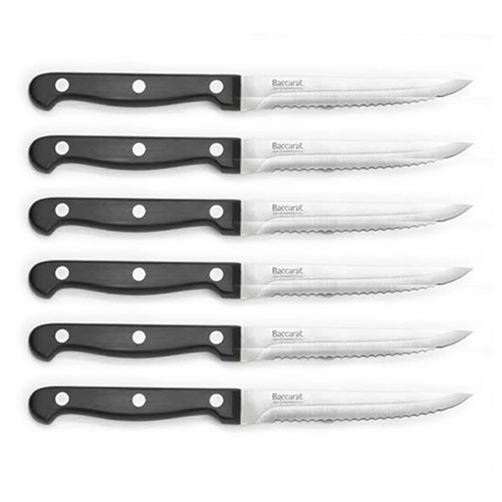 Take the expert quality of Baccarat knives and put them to use at the dinner table with the Baccarat Sabre 6 Piece Steak Knife Set. Crafted from premium quality German stainless steel, the Baccarat Sabre Steak Knives are forged with a full tang that has been triple riveted into ergonomic polymer handles for improved comfort and control while cutting. The finely pointed knife blades feature serrated edges designed to make cutting into meats efficient and easy, reducing tearing and crushing caused by blunt or straight edge blades. The ideal set for the meat lover in your life (maybe that’s you?), the Baccarat Sabre Steak Knife Set is a wonderful gift for birthdays, weddings, anniversaries and other special events and can be used for both casual and formal dining occasions. Dishwasher friendly, however hand washing is recommended.