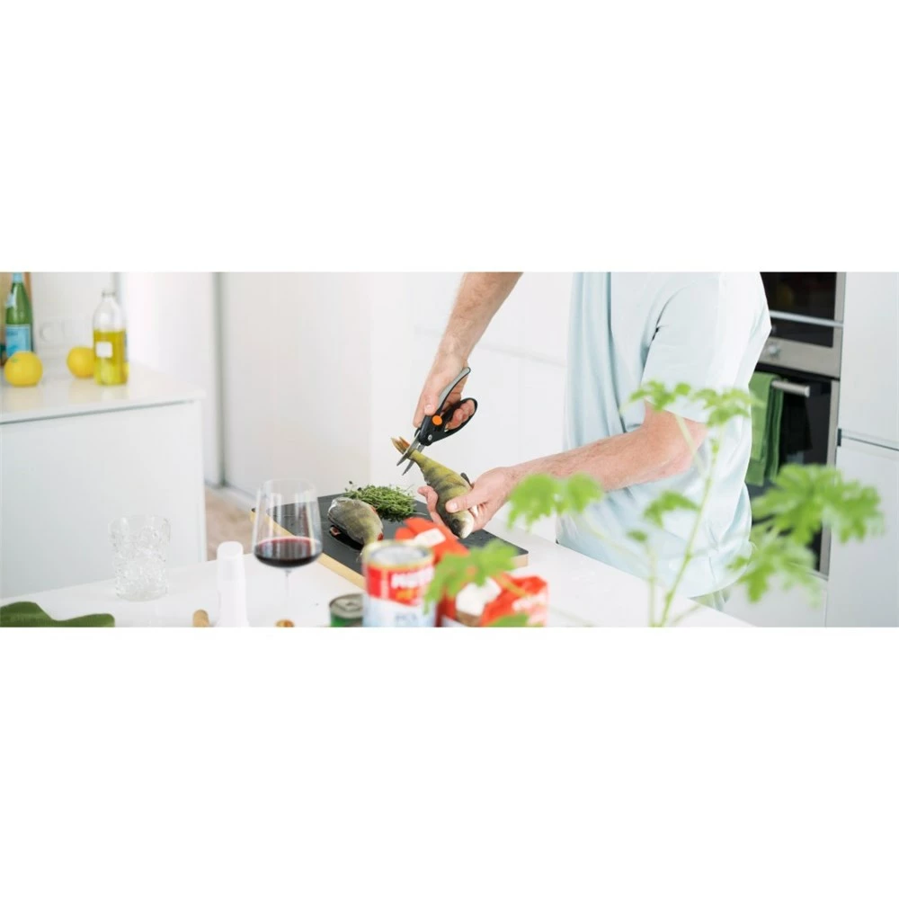 The Fiskars Fish Shear is the all in-1 scissors for all your fish preparation requirements. It can be used to remove scales, open and cut fish and remove fins as well as skinning, cutting and finishing poultry and game. The Fiskars Fish Shear features a Softgrip and ergonomic finger-loop handle which offers superior control and comfort and which is suitable for left or right handed use. It also features adjustable blade tension to help get the job done just right and once finished the blades can be locked with the thumb-operated locking mechanism for safe and convenient storage. Made in Finland from top quality and durable stainless steel, the Fiskars Fish Shear is dishwasher safe for complete and easy cleaning.