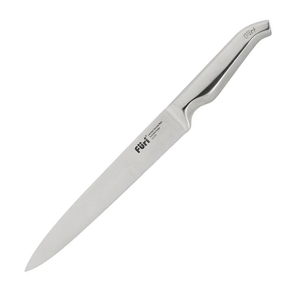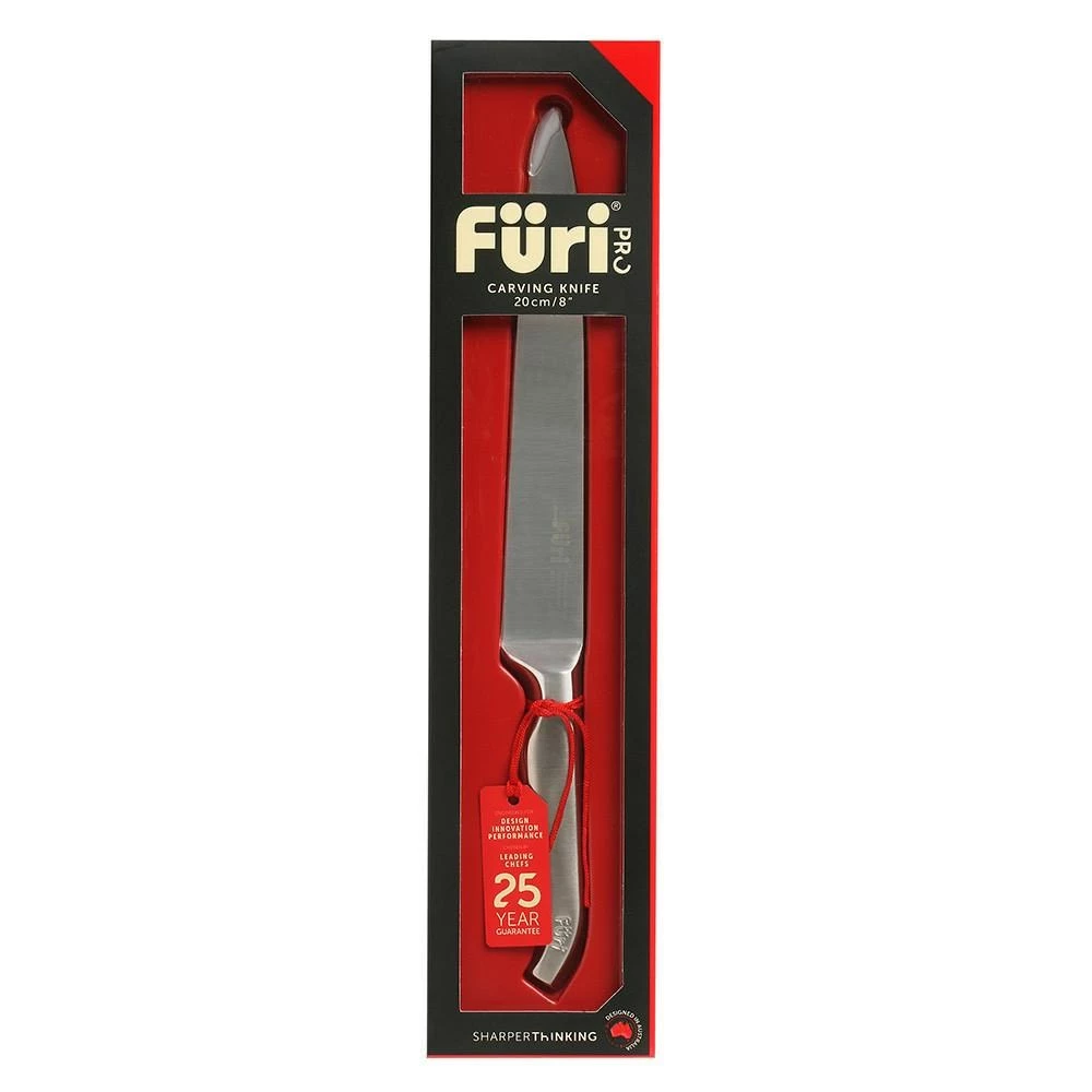 Whether it’s for special occasions or every day use, the Furi Pro Carving Knife gets the job done precisely and easily. The reverse wedged Furi Pro Carving Knife has a balanced 20cm blade. It provides exceptional control in carving a delicious Sunday roast or a delicate slow cooked lamb or for slicing cold meats, chicken and turkey. The Furi Pro Knife Range is made from Japanese steel and is resistant to staining, rusting and corrosion. Furi Knives feature a unique wedge shaped handle which reduces hand fatigue and is anti-slip making this ideal for professional chefs or amatuer cooks. Tech Edge technology allows for extremely sharp edges. The Furi Pro Knife Range comes with a 25 year guarantee against defects. Designed in Australia using only the best modern materials and the latest knife technology.
