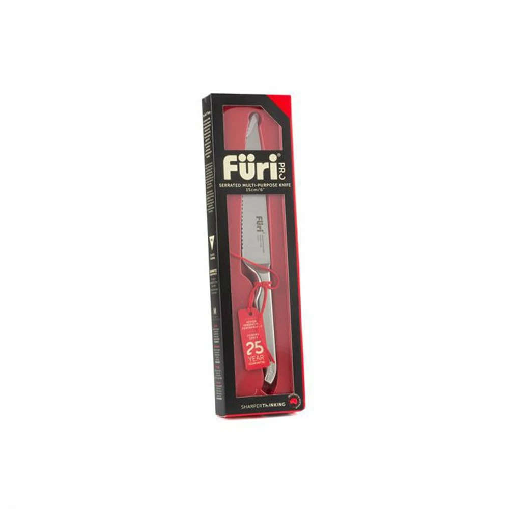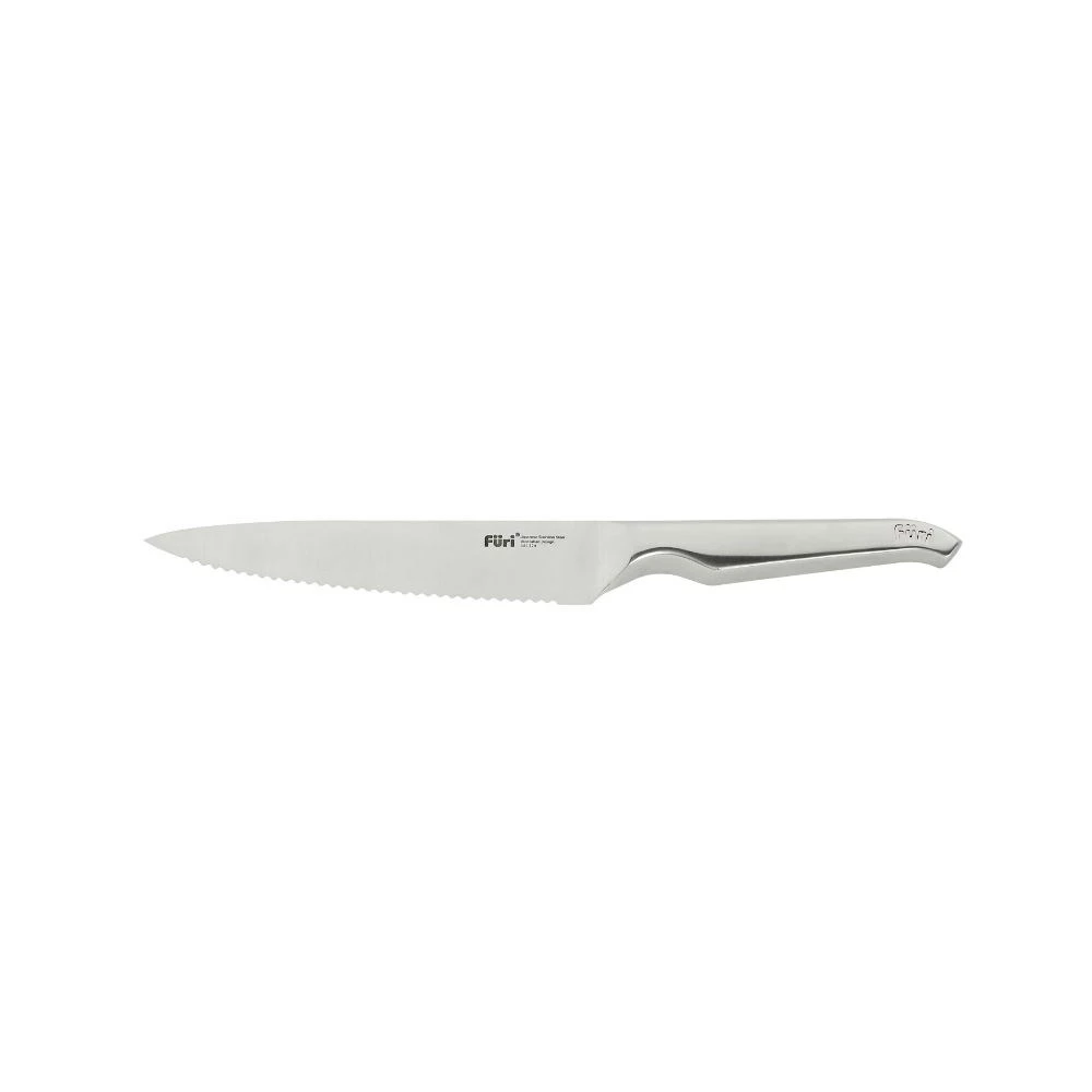 Designed with a finely serrated edge, the Furi Pro Serrated Multi-purpose Knife is perfect for slicing through foods with hard exteriors such as tomatoes (no more squashed tomatoes), hard cheeses, sausages and baguettes. The Furi Pro Serrated Multi-purpose Knife is so versatile that it will become one of your favourites! The Furi Pro Knife Range is made from Japanse steel and is resistant to staining, rusting and corrosion. Furi Knives feature a unique wedge shaped handle which reduces hand fatigue and is anti-slip making this ideal for professional chefs or amatuer cooks. Tech Edge technology allows for extremely sharp edges. The Furi Pro Knife Range comes with a 25 year guarantee against defects. Designed in Australia using only the best modern materials and the latest knife technology.
