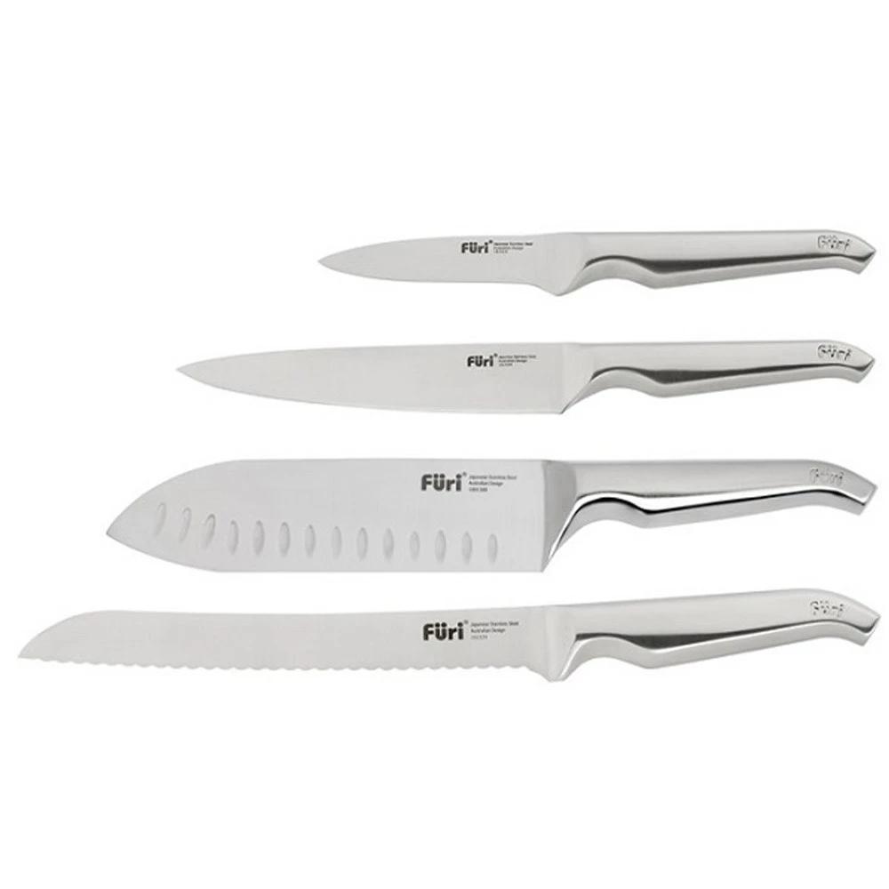 Each knife in this Furi Pro Wooden Knife Block Set 4 Piece is designed for chopping, slicing and dicing making this an ideal set for any kitchen. It comes complete with a beautifully designed modern wooden block, made from rubberwood and the exotic dark wood Sapele, which is hygienic and easy to clean. This stylish, lightweight and practical and easy-to-use set comes with a 15 cm Utility Knife for trimming meats, slicing fruit and all other everyday preparation, 20 cm Cook”s Knife for cutting and chopping meat and vegetables and a 20 cm Bread Knife with serrated edge for smoother bread cutting. The Furi Pro Knife Range is made from Japanese steel and is resistant to staining, rusting and corrosion. Furi Knives feature a unique wedge shaped handle which reduces hand fatigue and is anti-slip making this ideal for professional chefs or amatuer cooks. Tech Edge technology allows for extremely sharp edges. The Furi Pro Knife Range comes with a 25 year guarantee against defects. Designed in Australia using only the best modern materials and the latest knife technology.