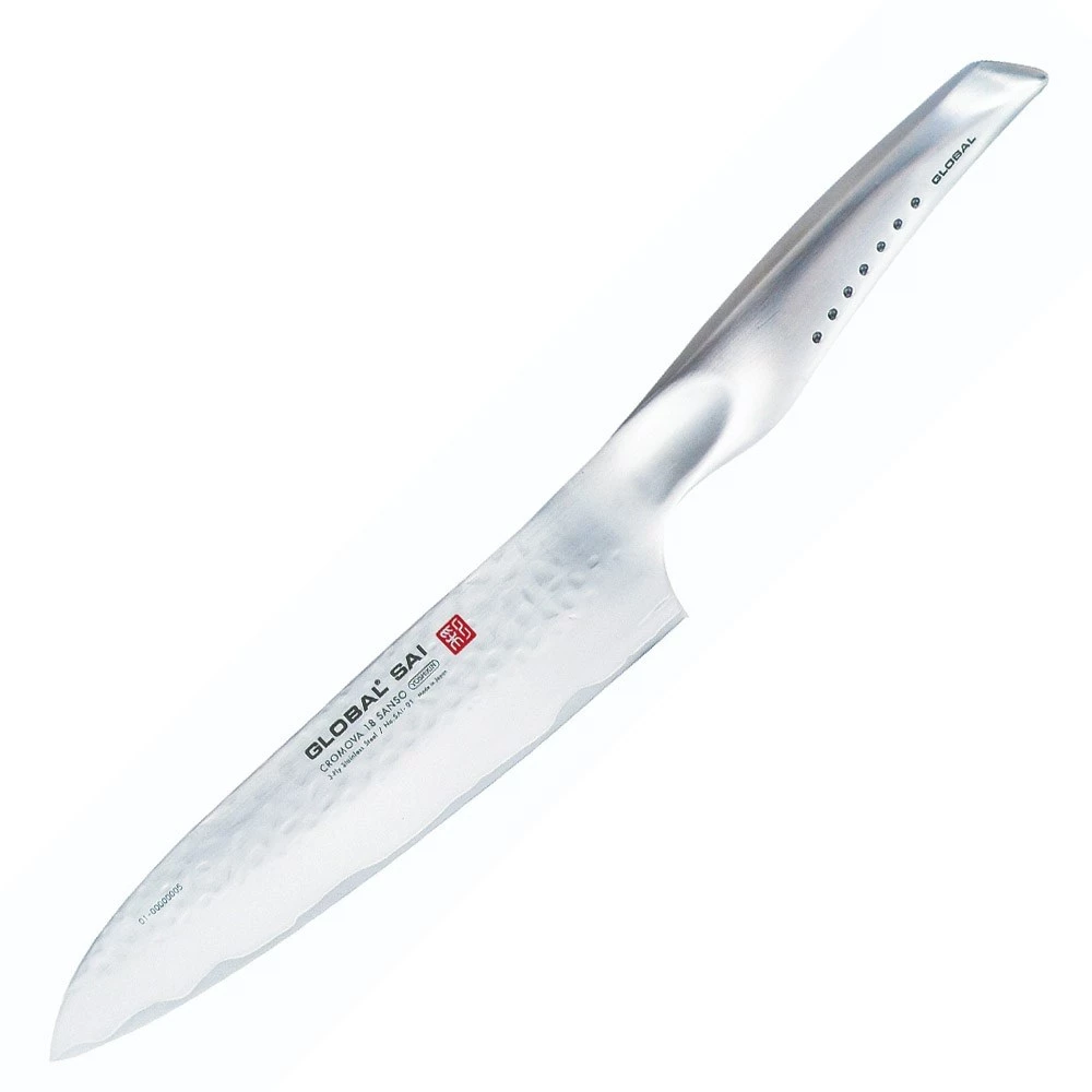 Crafted from three layers of superior-quality stainless steel, The Global Sai series is constructed with excellent durability with enhanced chip and rust-resistant performance. Each knife in the Sai series is hammered finish creating air pockets between chopped food allowing food to pass across the knife without sticking.