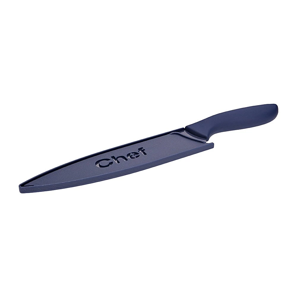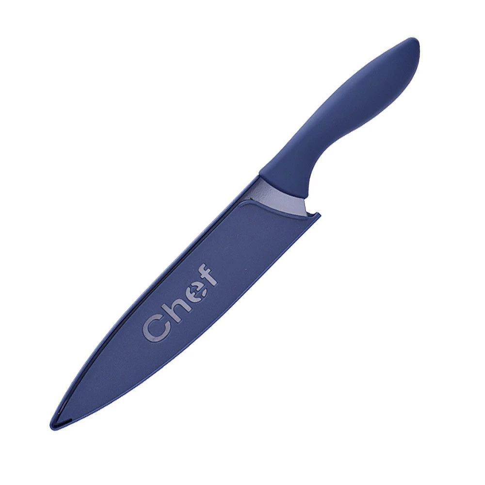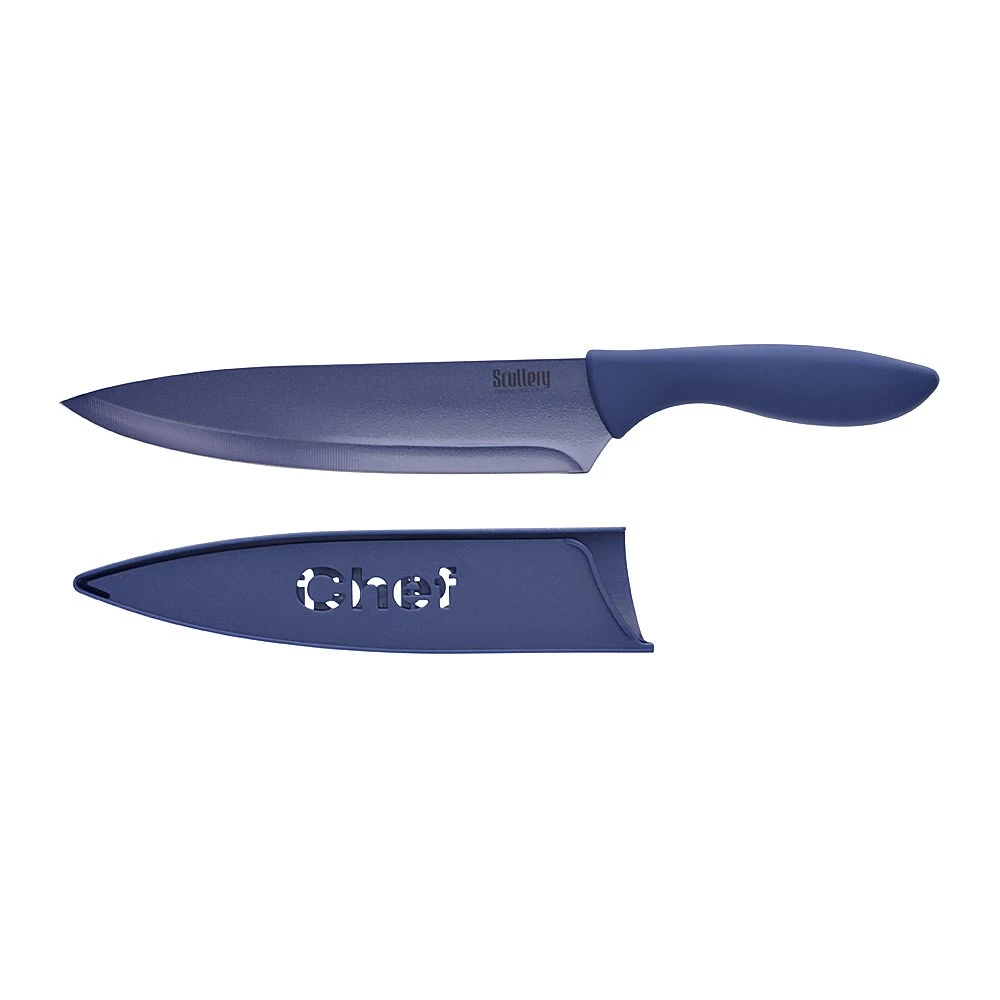 Chop fresh ingredients with enhanced precision and ease using the perfectly balanced Scullery Kolori Stainless Steel Chef’s Knife! Slice through meat, cheese, vegetables and more with this versatile knife and enjoy smooth slicing every time. Designed with a vibrant navy blue colour scheme, the Kolori Chef’s Knife brings a pop of personality to your kitchen and is easily identifiable next to the rest of your kitchen knife collection. The blade is constructed from professional grade stainless steel which offers enduring performance and features a non stick coating for smooth and easy slicing. Equipped with a soft touch ergonomic handle, this knife sits comfortably in your hand and offers a secure grip when in use. Ultra-durable and easy to clean, the Kolori Chef’s Knife is dishwasher safe for easy cleaning and your convenience. Mix and match with additional knives from the Kolori range for the ultimate coordinated culinary collection.