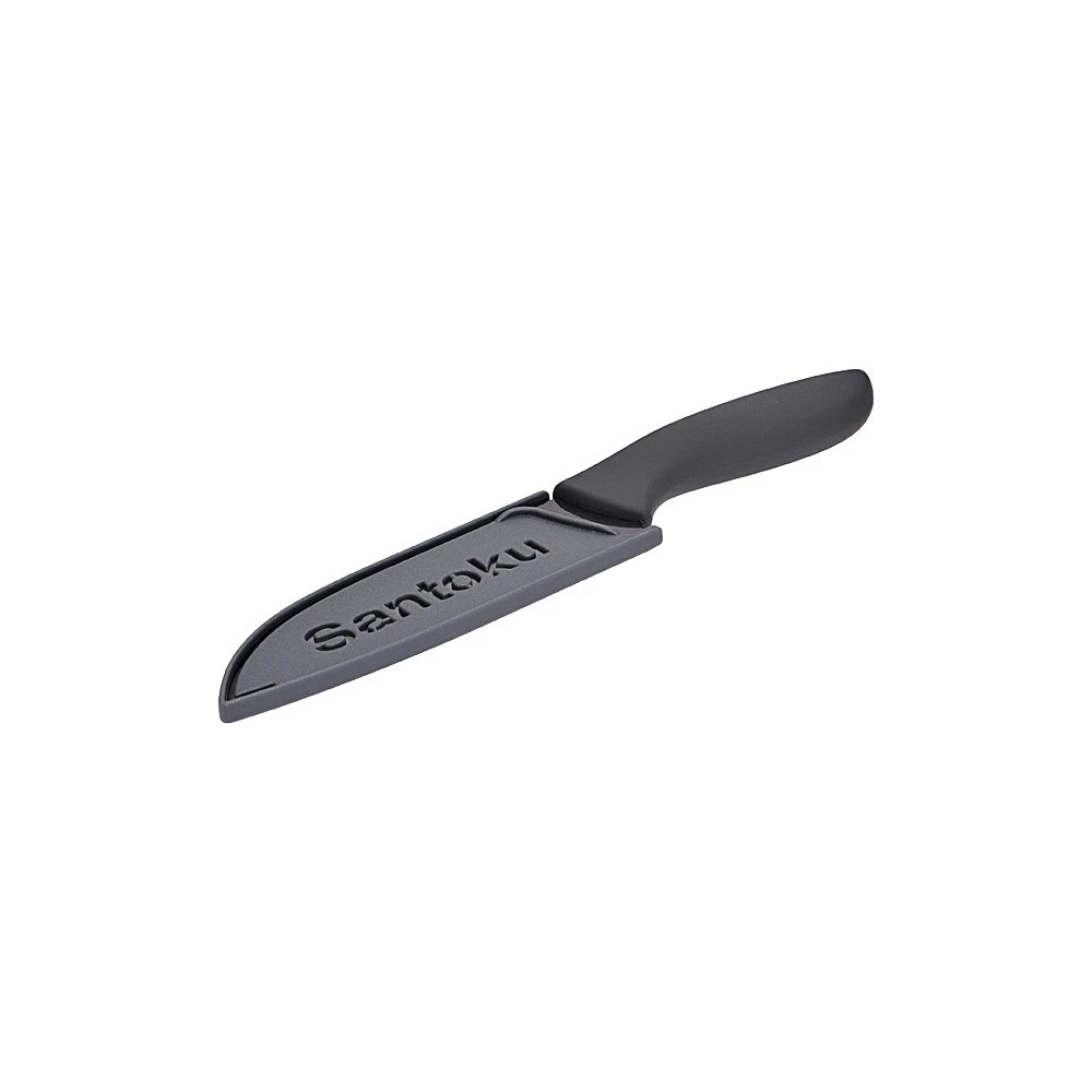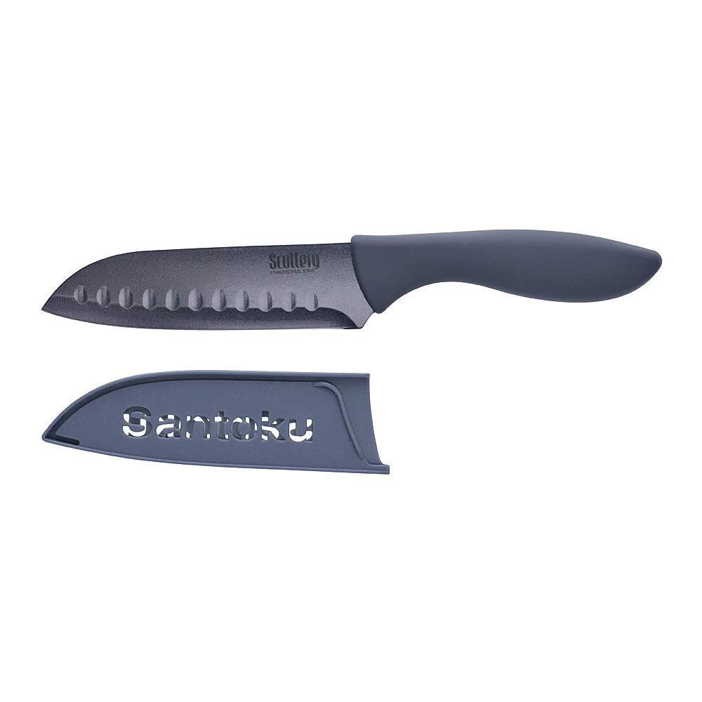 Slice and dice cheese, meat, fresh vegetables and more with the Scullery Kolori Stainless Steel Santoku Knife. Ideal for everyday meal preparation, this versatile knife is a must-have for any avid home cook. It boasts a sleek and sophisticated grey resin handle and a matching blade protector, ideal for adding a touch of contemporary style to your cooking space. This knife is designed with a professional quality stainless steel blade with a non stick coating, great for smooth and easy slicing. The soft touch handle is ergonomic in design, crafted for your comfort and ease of use while offering maximum grip. Ultra-durable and easy to clean, the Kolori Santoku Knife by Scullery is dishwasher safe for your convenience. Mix and match with additional essential knives from the Kolori range for the ultimate culinary collection.