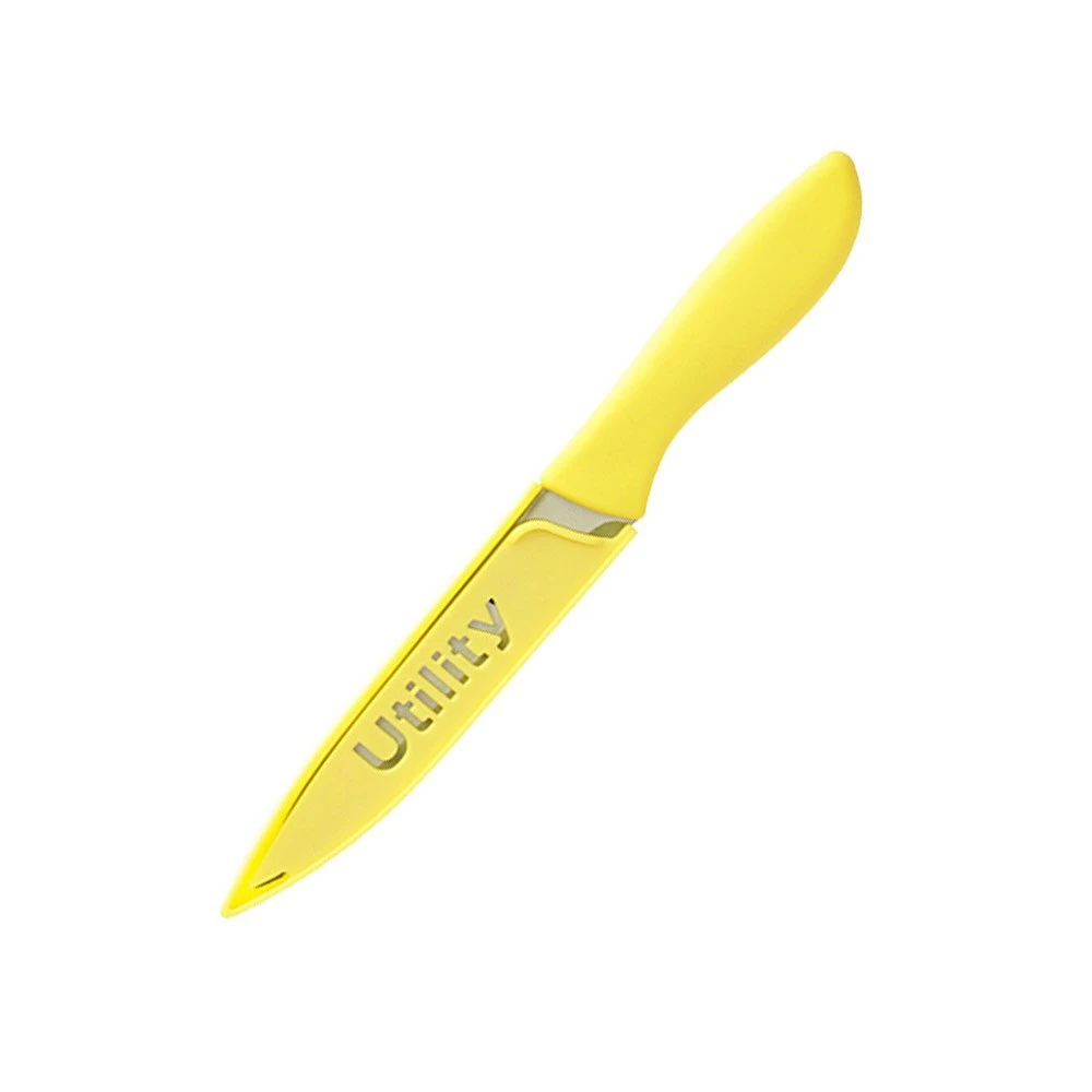 Prepare fresh ingredients for cooking with the razor sharp and perfectly balanced Scullery Kolori Stainless Steel Utility Knife! Versatile in function, this knife comes in handy for slicing and dicing vegetables, fruits, cheese and more. It is designed with a professional quality stainless steel blade, crafted with a superior non stick coating that allows for smooth and easy slicing. Boasting a beautiful yellow coloured resin handle and a matching blade protector, this knife is bound to bring a burst of vibrance to your kitchen. The soft touch handle is ergonomic in design, crafted for your comfort and ease of use while offering maximum grip. Ultra-durable and easy to clean, the Kolori Utility Knife by Scullery is dishwasher safe for your convenience. Mix and match with additional essential knives from the Kolori range for the ultimate culinary collection.