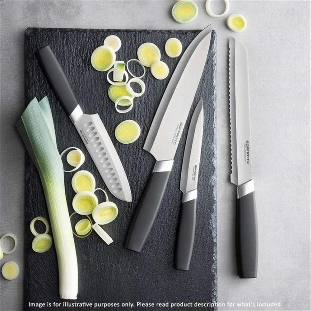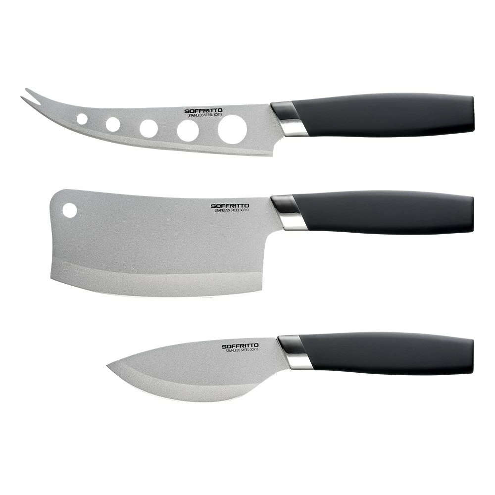 Create a cleaner, healthier environment on your kitchen counter or dining table with the Soffritto Antibacterial Cheese Knife Set. This 3-piece knife set includes 1 x fork-tipped knife, 1 x cleaver knife, and 1 x spade knife; the essential blades for cutting and serving a variety of soft, semi-soft, hard and semi-hard cheeses and p?t?s. Crafted from top quality stainless steel, the Soffritto Antibacterial Cheese Knives are double coated with ceramic and antibacterial layers that are designed to remain resistant to bacteria from raw foods, stains, and rust that can be caused by acidic and caustic foods such as citrus fruits or harsh cleaners. Fitted with ergonomic soft-touch handles and stay-sharp blade edges, the Soffritto Antibacterial Cheese Knives remain comfortable to hold and are perfect for giving your cheese boards and serving platters a chic touch.